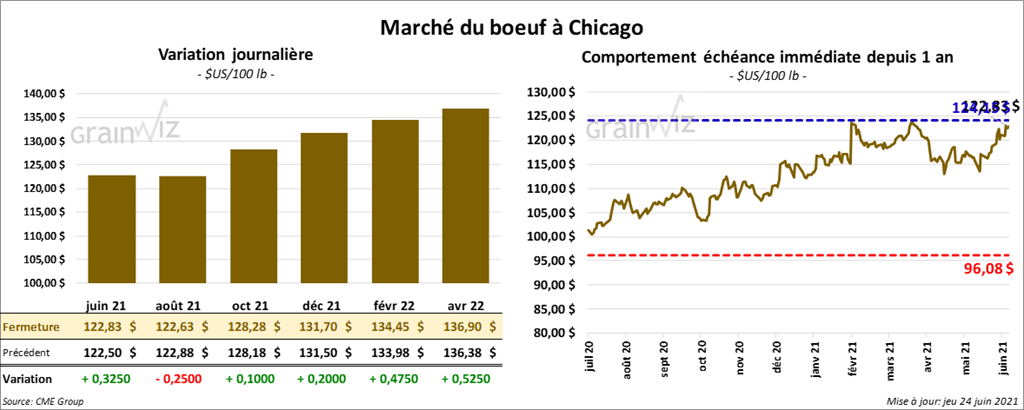 Les contrats de bœuf US aux échéances les plus rapprochées ont terminé la séance en hausse entre 10 et 32 cents. Celui août 21 a fait exception en clôturant en baisse de 25 cents. Les contrats de veau US aux échéances les plus rapprochées ont fini en progression entre 1,00 et 1,45 $.