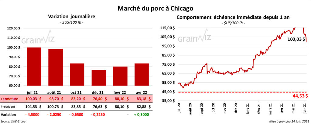 - Le 22 juin dernier, le CME Lean Hog Index était en baisse de 1,14 $ à 119,59 $.