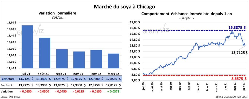 Les contrats de soya US aux échéances les plus rapprochées ont fini la session en baisse entre 1 ¼ et 6 ½ cents. Ceux de tourteau de soya US aux échéances les plus rapprochées ont fait de même en clôturant avec des pertes entre 8,40 et 9,20 $/tonne. Les contrats d’huile de soya US aux échéances les plus rapprochées ont terminé en hausse entre 57 et 70 points.