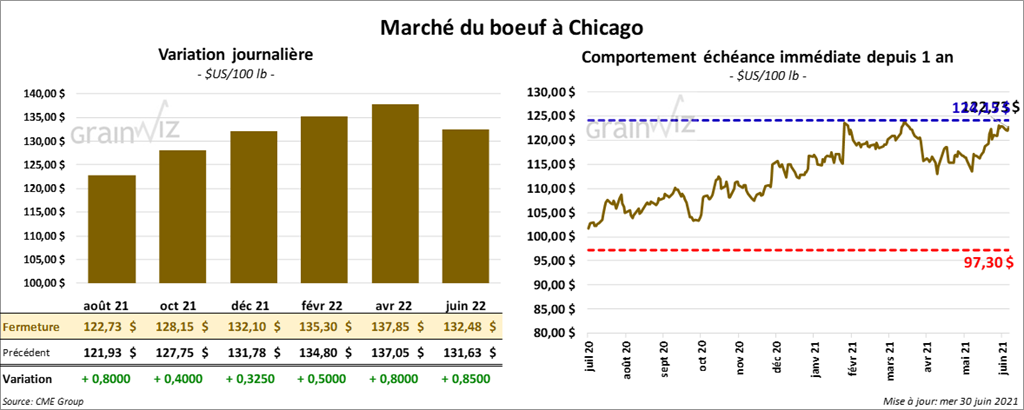 - Le 28 juin dernier, le CME Feeder Cattle était en hausse de 54 cents à 146,72 $.