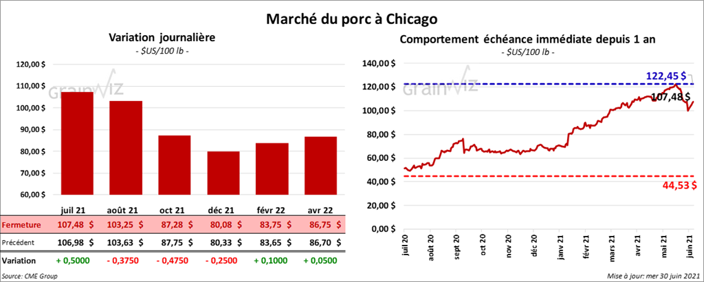 Les contrats de porc US aux échéances les plus rapprochées ont clôturé en baisse entre 25 et 47 cents. Celui juillet 21 a fait exception en terminant en hausse de 50 cents.