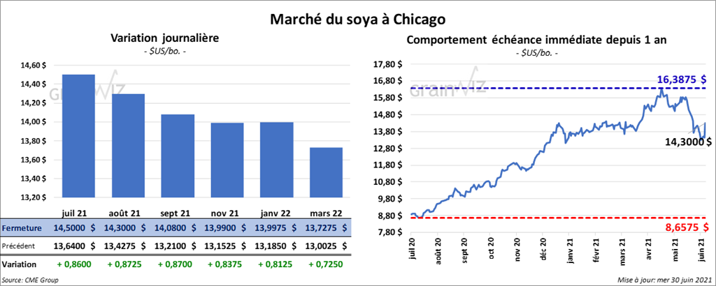 Les contrats de soya US aux échéances les plus rapprochées ont fini la journée en hausse entre 86 et 87 ¼ cents. Ceux de tourteau de soya US aux échéances les plus rapprochées ont également fermé avec des gains entre 27,10 et 27,90 $/tonne. Les contrats d’huile de soya US ont clôturé en progression entre 101 et 130 points.