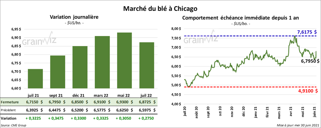À Chicago, les contrats de blé aux échéances les plus rapprochées ont clôturé en hausse entre 32 ¼ et 34 ¾ cents. À Kansas, ceux de blé dur rouge ont aussi terminé dans le vert entre 29 ½ et 32 cents. À Minneapolis, les contrats de blé de printemps ont fermé avec des gains entre 33 ¾ et 48 ¾ cents.