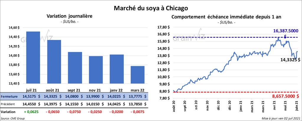 Les contrats de soya US aux échéances les plus rapprochées ont fini la journée en baisse entre 2 et 7 ½ cents. Ceux de tourteau de soya US aux échéances les plus rapprochées ont fait de même en clôturant en recul entre 60 cents et 1,90 $/tonne. Les contrats d’huile de soya US aux échéances les plus rapprochées ont fait l’inverse en terminant en hausse entre 82 et 178 points.