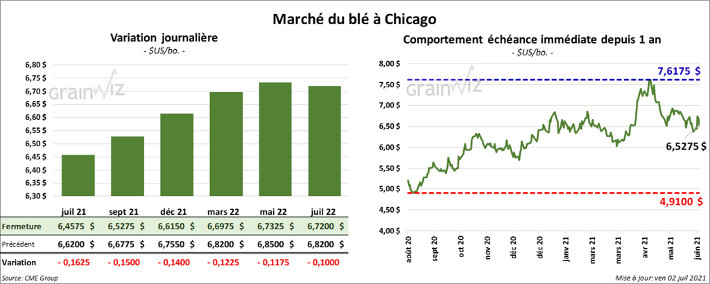 À Chicago, les contrats de blé aux échéances les plus rapprochées ont fermé en baisse entre 12 ¼ et 15 cents. À Kansas, ceux de blé dur rouge aux échéances les plus rapprochées ont clôturé avec des pertes entre 15 ¼ et 19 cents. À Minneapolis, les contrats de blé de printemps aux échéances les plus rapprochées ont fini la journée en hausse entre 1 ¼ et 2 ¼ cents.
