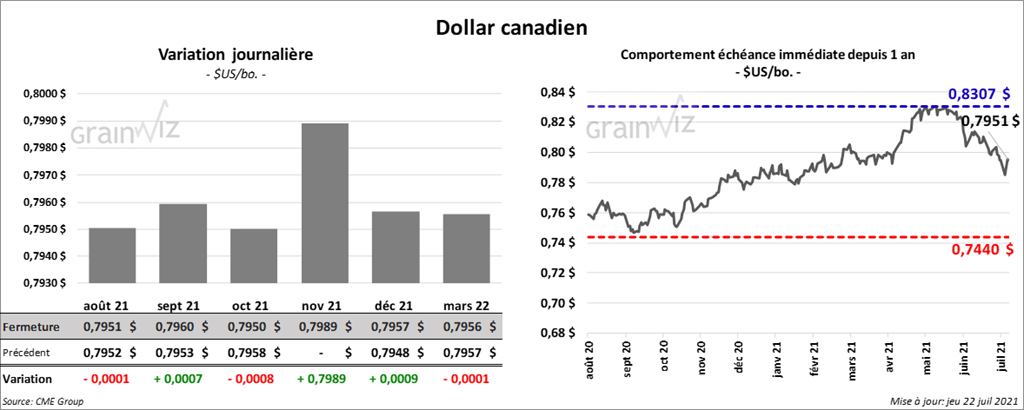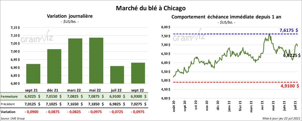 - Durant la semaine du 15 juillet dernier, les ventes à l’exportation de blé US 2021/22 ont été de 473,200 tonnes, soit une augmentation de 11 % comparativement à la semaine précédente et une hausse de 44 % par rapport à la moyenne des 4 dernières semaines. La Chine et les Philippines ont été les principaux acheteurs. Les attentes des marchés étaient entre 350,000 et 600,000 tonnes. Les analystes considèrent ces données sur les ventes comme acceptables.