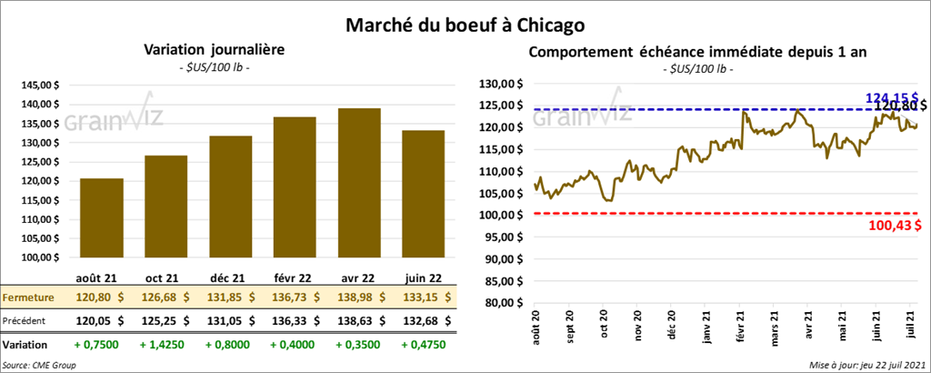 - Le 21 juillet dernier, le CME Feeder Cattle Index était en progression de 68 cents à 151,39 $.