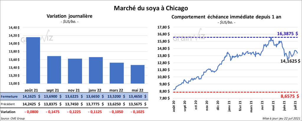 Les contrats de soya US aux échéances les plus rapprochées ont clôturé en baisse entre 8 et 14 ¾ cents. Ceux de tourteau de soya US aux échéances les plus rapprochées ont également fermé en recul entre 6,60 et 8,00 $/tonne. Les contrats d’huile de soya US aux échéances les plus rapprochées ont terminé la session avec des pertes entre 46 et 69 points.