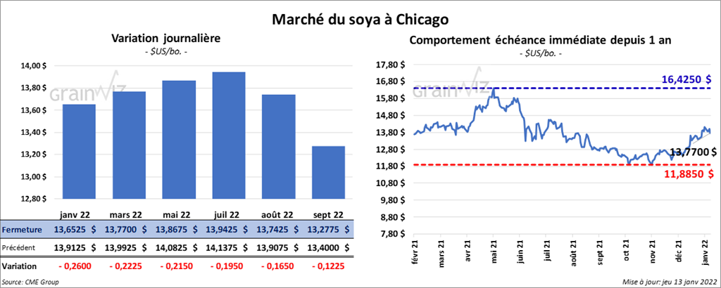Les contrats de soya US aux échéances les plus rapprochées clôturé en recul entre 19 ½ et 22 ¼ cents. Ceux de tourteau de soya US aux échéances les plus rapprochées ont également fini dans le rouge entre 7,20 et 7,30 $/tonne. Les contrats d’huile de soya US aux échéances les plus rapprochées ont fermé avec des pertes entre 88 et 93 points.