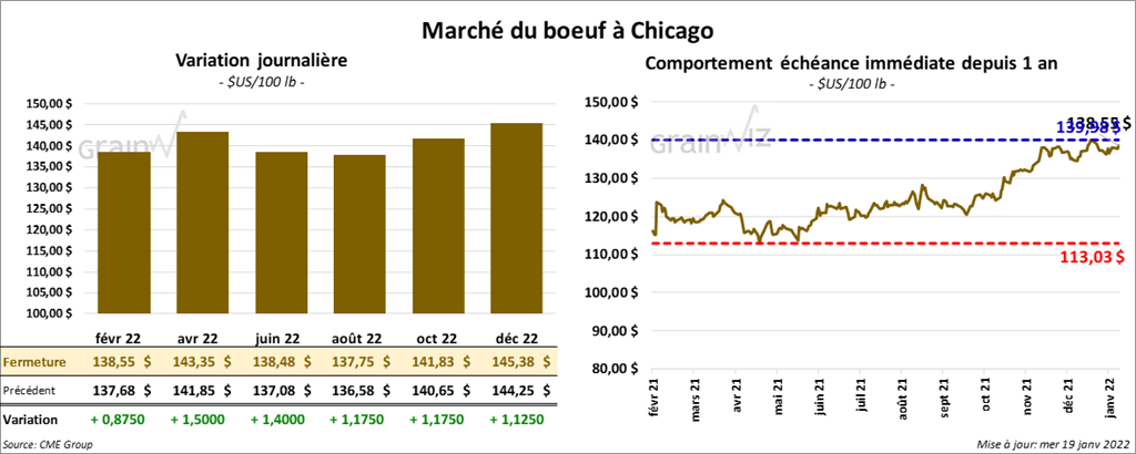 Les contrats de bœuf US aux échéances les plus rapprochées ont fini en hausse entre 87 cents et 1,50 $. Ceux de veau US aux échéances les plus rapprochées ont également clôturé en progression entre 20 et 47 cents. Celui janvier 22 a fait exception en fermant en baisse de 5 cents.