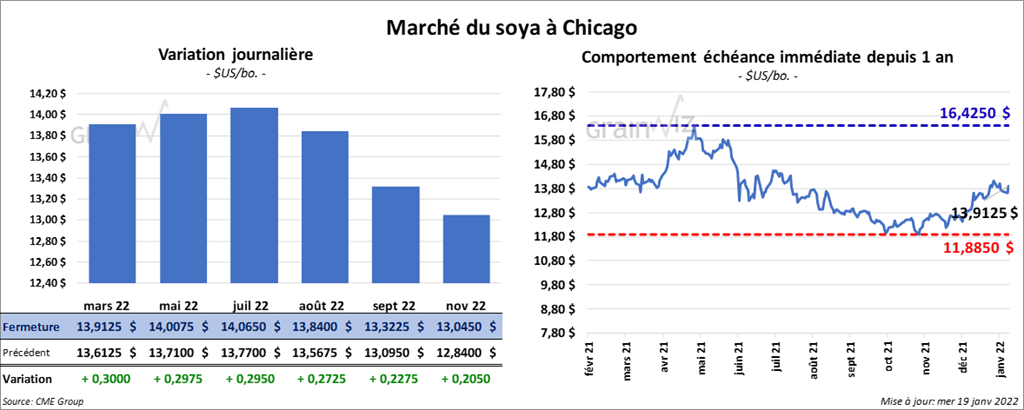Les contrats de soya US aux échéances les plus rapprochées ont fini la séance en progression entre 29 ½ et 30 cents. Ceux de tourteau de soya US aux échéances les plus rapprochées ont également terminé dans le vert entre 6,50 et 8,20 $/tonne. Les contrats d’huile de soya US aux échéances les plus rapprochées ont clôturé en progression entre 167 et 168 points.