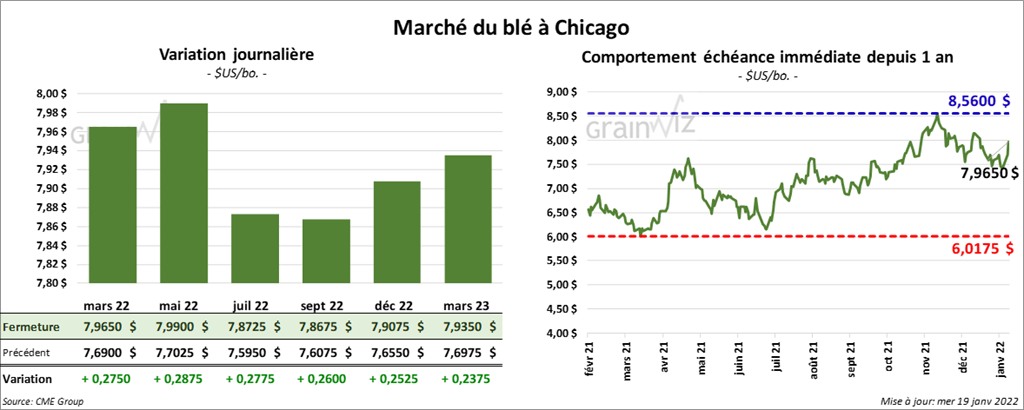 À Chicago, les contrats de blé US aux échéances les plus rapprochées ont terminé la session dans le vert entre 27 ½ et 28 ¾ cents. À Kansas, ceux de blé dur rouge ont clôturé en hausse entre 27 ¼ et 28 ½ cents. À Minneapolis, les contrats de blé de printemps aux échéances les plus rapprochées ont fermé avec des gains entre 29 ½ et 32 ¾ cents.