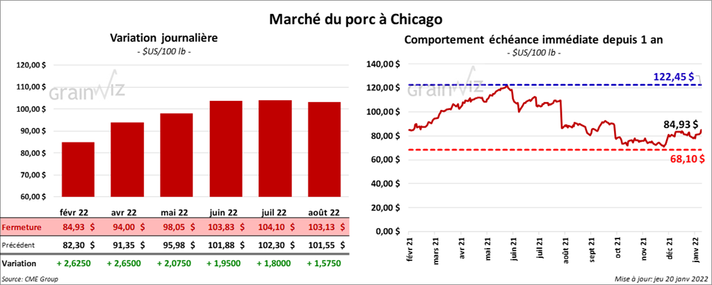 - Le 18 janvier dernier, le CME Lean Hog Index était en progression de 7 cents à 76,85 $.