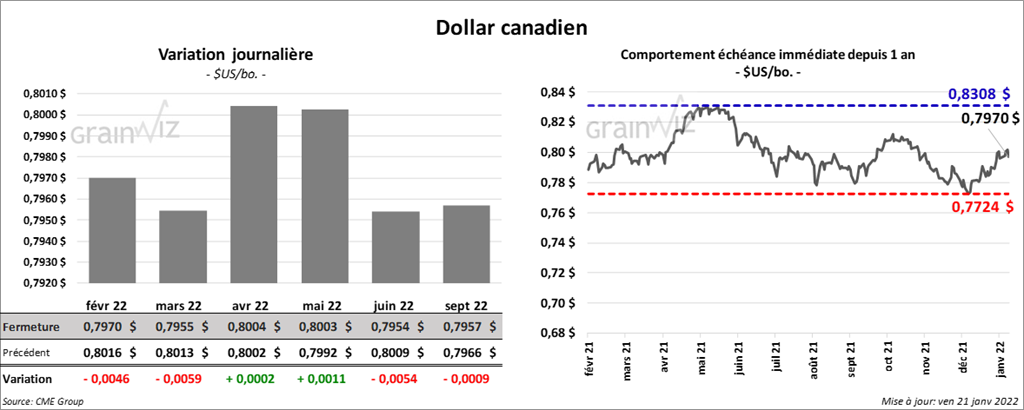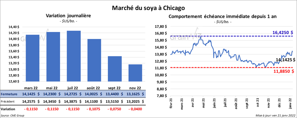 - Au cours de la semaine du 13 janvier dernier, les ventes à l’exportation de soya US 2021/22 ont été de 671,000 tonnes, soit en baisse de 9 % comparativement à la semaine précédente et en hausse de 12 % par rapport à la moyenne des 4 dernières semaines. La Chine et le Mexique ont été les principaux acheteurs. Les prévisions des analystes étaient entre 600,000 et 1,2 million de tonnes. Pour 2022/23, les ventes à l’exportation ont été de 528,000 tonnes. La Chine et les destinations inconnues ont été les plus gros acheteurs. Les attentes des analystes étaient entre 100,000 et 300,000 tonnes.