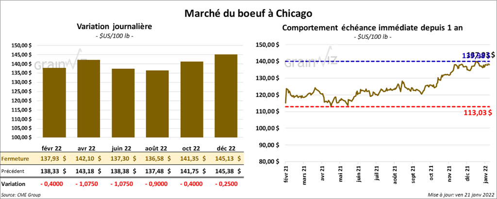 - Le rapport Cattle on Feed du mois de janvier a été présenté cet après-midi. Il montre qu’au 1er janvier dernier, les inventaires des parcs d’engraissement étaient en légère hausse par rapport au mois précédent à 12,037 millions de têtes. C’était aussi une augmentation de 0,6 % comparativement à la même période en 2021. Les analystes s’attendaient plutôt à une baisse des stocks à 11,943 millions de têtes. Par ailleurs, les placements en décembre dernier ont été en hausse de 6,5 % par rapport à l’année précédente à 1,963 million de têtes. Les analystes anticipaient une augmentation de 5 %. Quant à la commercialisation, en décembre dernier, elle a été en hausse de 0,2 % comparativement à l’année précédente à 1,857 million de têtes. Les analystes projetaient une augmentation de 0,8 %.