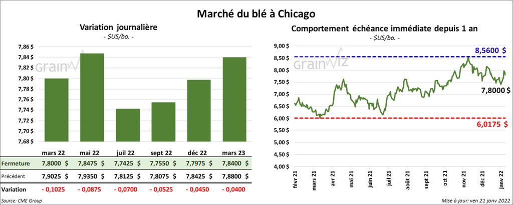 - Durant la semaine du 13 janvier dernier, les ventes à l’exportation de blé US 2021/22 ont été de 380,600 tonnes, ce qui était une hausse de 44 % comparativement à la semaine précédente et une augmentation de 62 % par rapport à la moyenne des 4 dernières semaines. Le Nigeria et le Guatemala ont été les plus gros acheteurs. Pour 2022/23, les ventes à l’exportation ont été de 72,000 tonnes. La Thaïlande et le Mexique ont été les principaux acheteurs. Les projections des analystes étaient entre 175,000 et 400,000 tonnes.