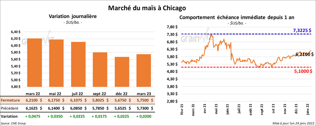 - L’USDA a rapporté aujourd’hui des ventes privées à l’exportation de 150,000 tonnes de maïs US pour des destinations inconnues. Les livraisons sont prévues en 2021/22.