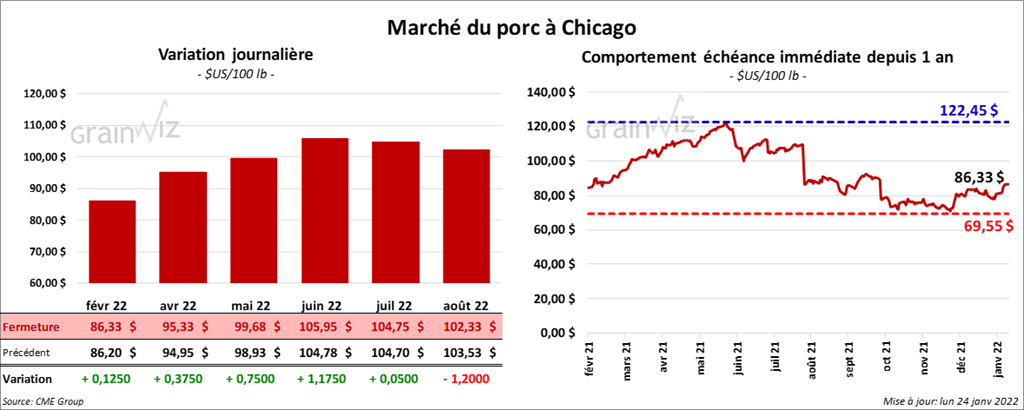 - Le 20 janvier dernier, le CME Lean Hog Index a été en hausse de 72 cents à 77,51 $.