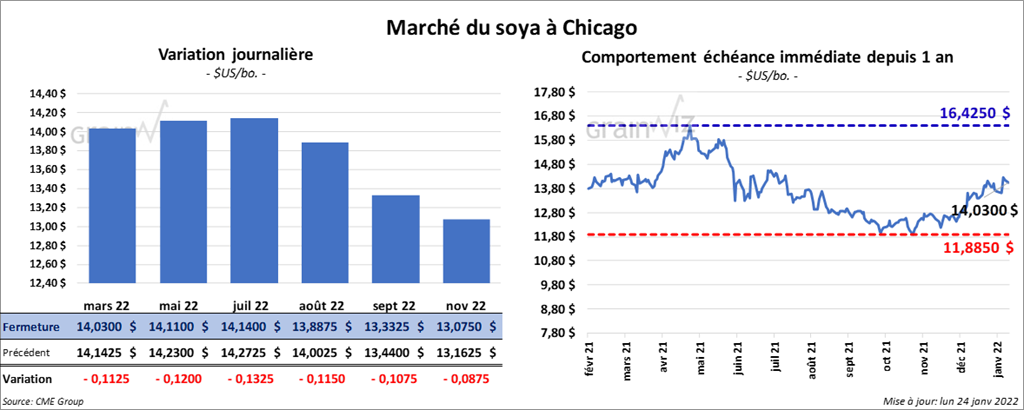 Les contrats de soya US aux échéances les plus rapprochées ont terminé la journée en baisse entre 11 ¼ et 13 ¼ cents. Ceux de tourteau de soya US ont fait l’inverse en fermant en hausse entre 60 cents et 1,20 $/tonne. Celui juillet 22 a fait exception en finissant en baisse de 10 cents. Les contrats d’huile de soya US aux échéances les plus rapprochées ont clôturé avec des pertes entre 103 et 105 points.