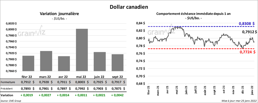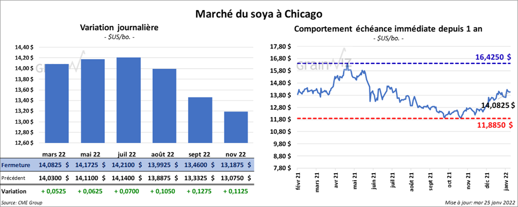 Les contrats de soya US aux échéances les plus rapprochées ont clôturé avec des gains entre 5 ¼ et 7 cents. Ceux de tourteau de soya US aux échéances les plus rapprochées ont fait l’inverse en fermant en baisse entre 1,60 et 2,10 $/tonne. Les contrats d’huile de soya US aux échéances les plus rapprochées ont fini en progression entre 58 et 59 points.