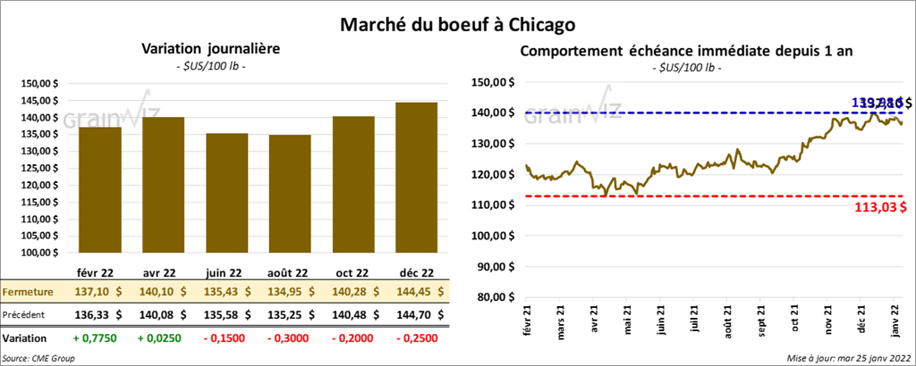 Les contrats de bœuf US aux échéances les plus rapprochées ont terminé en hausse entre 2 et 77 cents. Celui juin 22 a fait exception en clôturant en baisse de 15 cents. Les contrats de veau US aux échéances les plus rapprochées ont fermé en baisse de 1,10 et 1,40 $. Celui janvier 22 a fait exception en finissant en hausse de ¾ cent.