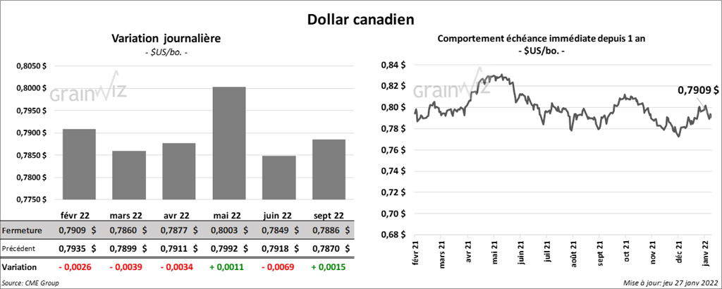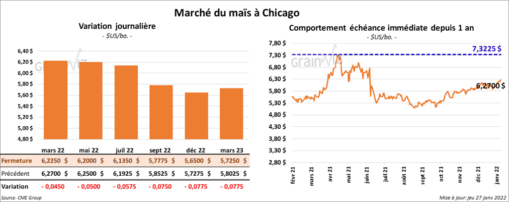 - Durant la semaine du 20 janvier dernier, les ventes à l’exportation de maïs US 2021/22 ont été de 1,402,300 tonnes, ce qui était une augmentation de 29 % par rapport à la semaine précédente et une hausse de 84 % comparativement à la moyenne des 4 dernières semaines. Le Japon et le Mexique ont été les principaux acheteurs. Les prévisions des analystes étaient entre 600,000 et 1,2 million de tonnes. Pour 2022/23, les ventes à l’exportation ont été de 165,000 tonnes. Le Japon et le Mexique ont été les plus gros acheteurs. Les anticipations des analystes étaient entre 0 et 200,000 tonnes.
