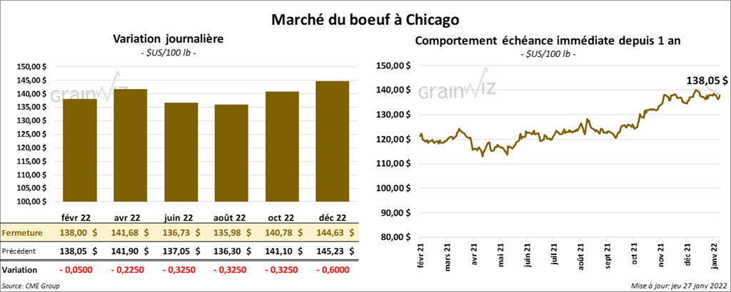Les contrats de bœuf US aux échéances les plus rapprochées ont terminé en baisse entre 5 et 32 cents. Ceux de veau US aux échéances les plus rapprochées ont fini en recul entre 1,10 et 1,30 $. Celui janvier 22 a fait exception en fermant en hausse de 20 cents.