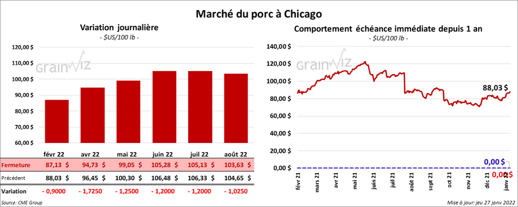 - Le 25 janvier dernier, le CME Lean Hog Index était en hausse de 75 cents à 79,20 $.
