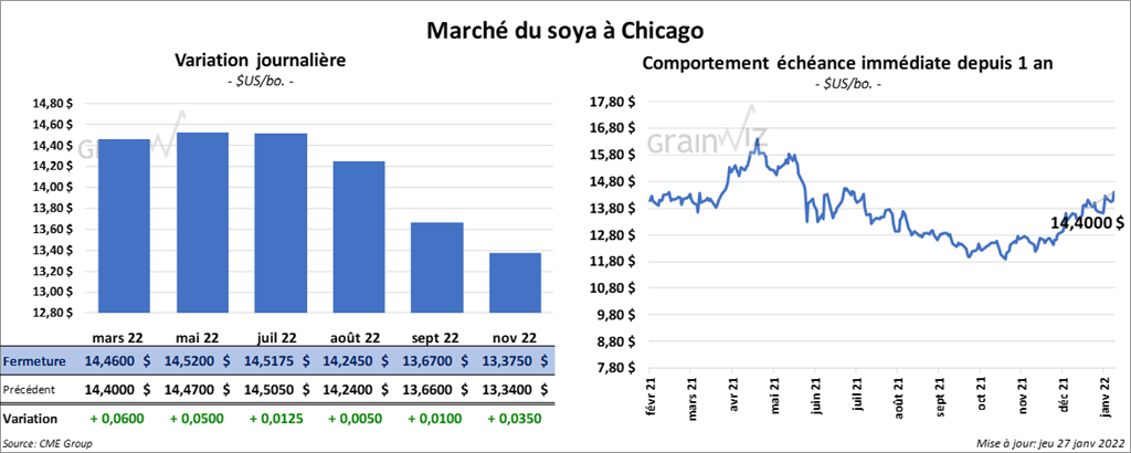 Les contrats de soya US aux échéances les plus rapprochées ont terminé la journée en hausse entre 1 ¼ et 6 cents. Ceux de tourteau de soya US aux échéances les plus rapprochées ont également fini en progression entre 3,00 et 4,40 $/tonne. Les contrats d’huile de soya US aux échéances les plus rapprochées ont fermé avec des gains entre 25 et 31 points.