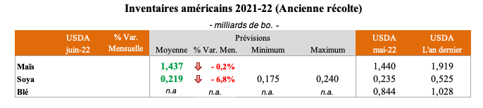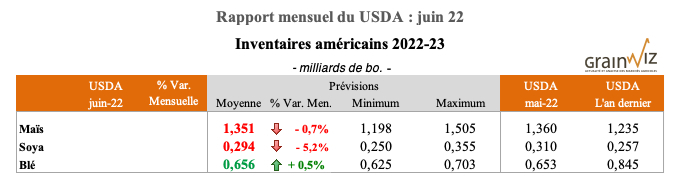 Le rapport d’offre de demande sera présenté demain. Les analystes anticipent des inventaires de fin d’année de maïs US 2022/23 à 1,351 milliards de boisseaux dans un jeu entre 1,198 et 1,505 milliard de boisseaux. En mai dernier, l’USDA avait évalué des inventaires plus élevés à 1,360 milliard de boisseaux. Pour 2021/22, les analystes s’attendent à ce que les inventaires de fin d’année de maïs soient en baisse de 0,2 % par rapport à mai à 1,437 milliard de boisseaux. Ils projettent aussi que la production américaine de maïs sera en baisse de 0,1 % comparativement à mai à 14,450 milliards de boisseaux.