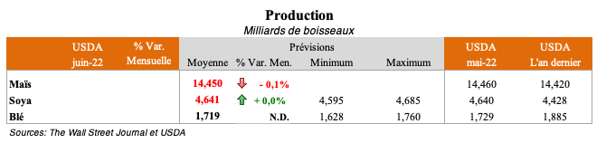 Pour le soya US, les analystes s’attendent à des inventaires de fin d’année de 2022/23 à 294 millions de boisseaux dans un jeu entre 250 et 355 millions de boisseaux. Il s’agirait d’une baisse mensuelle de 5,2 %. Pour 2021/22, les stocks de fin d’année sont prévus en baisse de 6,8 % par rapport à mai à 219 millions de boisseaux dans un jeu entre 175 et 240 millions de boisseaux. Dans le cas de la production de soya US, les analystes projettent une augmentation de 1 million de boisseaux par rapport au mois précédent à 4,641 milliards de boisseaux. Les attentes varient entre 4,595 et 4,685 milliards de boisseaux.