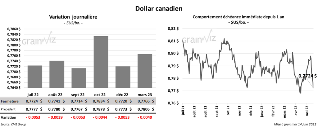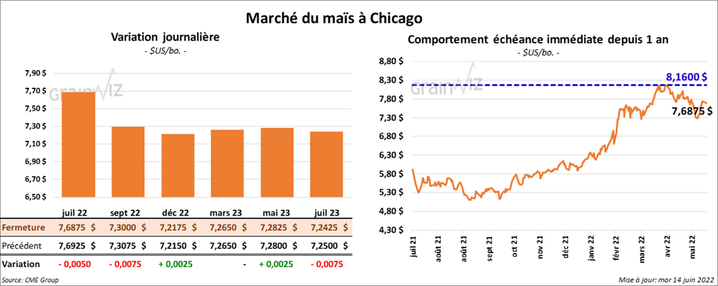 Les contrats de maïs US aux échéances les plus rapprochées ont terminé la séance en baisse entre ½ et ¾ cent. Celui décembre 22 a fait exception en finissant en hausse de ¼ cent.