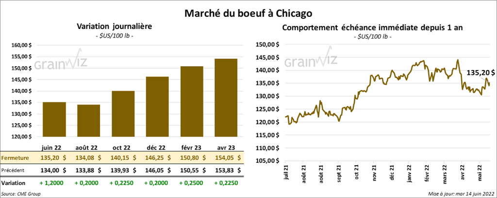 Les contrats de bœuf US aux échéances les plus rapprochées ont terminé la journée en hausse entre 20 cents et 1,00 $. Ceux de veau US aux échéances les plus rapprochées ont fini en baisse entre 0,01 et 0,14 %.