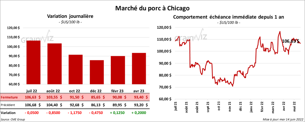 - Le 10 juin dernier, le CME Lean Hog Index était en hausse de 21 cents à 107,40 $.