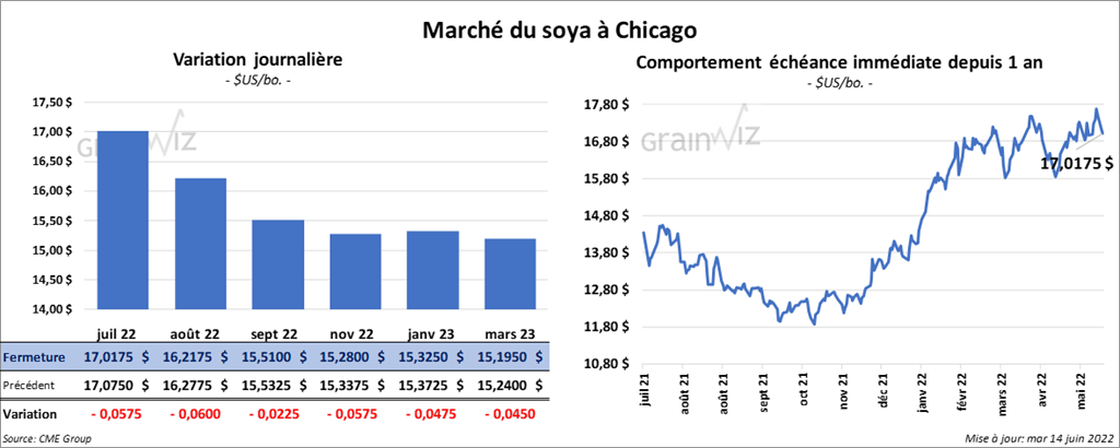 Les contrats de soya US aux échéances les plus rapprochées ont clôturé avec des pertes entre 2 ¼ et 6 cents. Ceux d’huile de soya US aux échéances les plus rapprochées ont également fini la journée en baisse entre 4,30 et 5,40 $/tonne. Les contrats d’huile de soya US aux échéances les plus rapprochées ont terminé en recul entre 99 et 123 points.