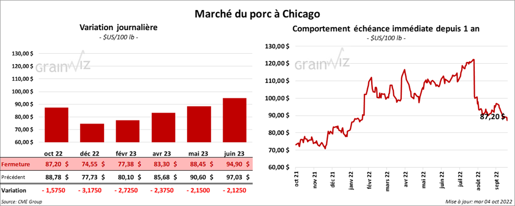 - Le 30 septembre dernier, le CME Lean Hog Index était en baisse de 58 cents à 94,33 $.