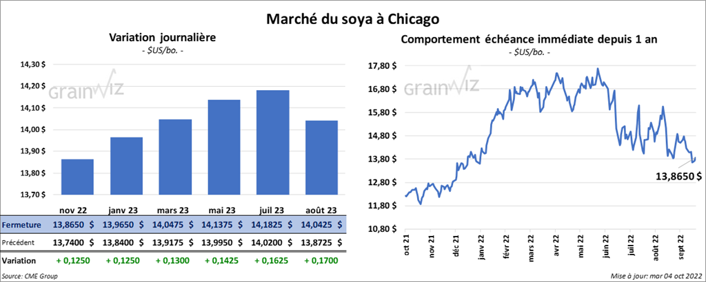 Les contrats de soya US aux échéances les plus rapprochées ont clôturé avec des gains entre 12 ½ et 13 cents. Ceux de tourteau de soya US aux échéances les plus rapprochées ont fait l’inverse en finissant la journée en baisse entre 2,40 et 3,70 $/tonne. Les contrats d’huile de soya US aux échéances les plus rapprochées ont fermé en hausse entre 163 et 168 points.