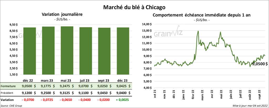 À Chicago, les contrats de blé aux échéances les plus rapprochées ont fini la session en recul entre 6 ½ et 7 ¼ cents. À Kansas, ceux de blé dur rouge aux échéances les plus rapprochées ont clôturé entre le neutre et une baisse de 1 ¼ cent. À Minneapolis, les contrats de blé de printemps ont terminé dans le rouge entre 1 ¾ et 4 ¾ cents.
