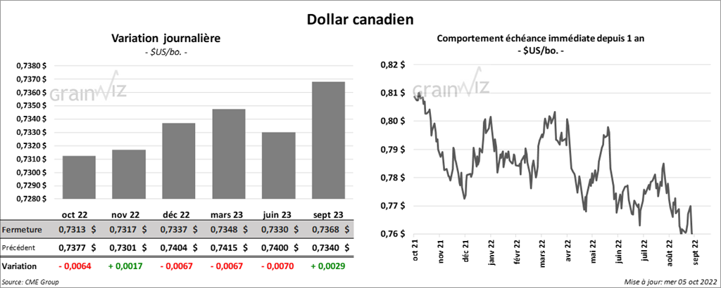 - En Europe, les autorités de l’UE ont accepté de plafonner le prix du pétrole russe comme sanction additionnelle contre la Russie qui a annexé illégalement certaines parties de l’Ukraine. Elles cherchent également à réduire la dépendance de l’UE face à cette denrée. De leur côté, les pays du G7 devraient annoncer dans les prochaines semaines qu’ils vont formellement plafonner le prix du pétrole russe. La date butoir pour en arriver à un accord entre les États membres est le 5 décembre prochain, date à laquelle les sanctions additionnelles de l’UE vont également entrer en vigueur. À noter que le plafonnement du prix du pétrole russe inquiète les industries européennes énergivores qui anticipent un ralentissement économique. Malheureusement, elles ne sont pas au bout de leur peine puisqu’aujourd’hui, les membres de l’OPEP+, dont fait partie la Russie, se sont entendus pour freiner la production de pétrole de 2 millions de barils par jour. Ce serait donc la plus forte baisse depuis 2020, lors des mesures drastiques appliquées mondialement pour éradiquer la pandémie de COVID-19. Cette mesure débutera en novembre. Une forte hausse du prix du pétrole au de-là des 100 $ US le baril est donc possible et à terme, elle pourrait engendrer une augmentation des coûts pour la production agricole dans divers pays.