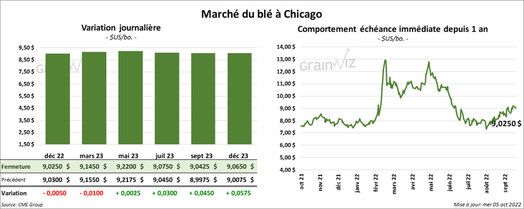 À Chicago, les contrats de blé aux échéances les plus rapprochées ont fermé avec des pertes entre ½ et 1 cent. Celui mai 23 a fait exception en clôturant en hausse de ¼ cent. À Kansas, ceux de blé dur rouge aux échéances les plus rapprochées ont fini la séance en progression entre 1 ½ et 3 ¼ cents. À Minneapolis, les contrats de blé de printemps aux échéances les plus rapprochées ont clôturé avec des gains entre 4 ¾ et 5 ¼ cents.