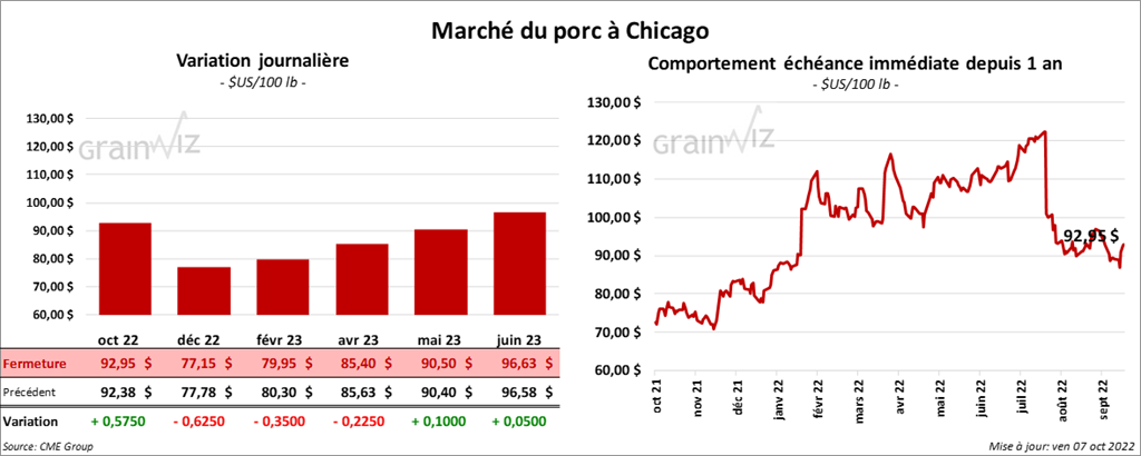 - Le 5 octobre dernier, le CME Lean Hog Index était en baisse de 16 cents à 92,77 $.