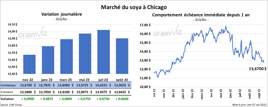 Les contrats de soya US aux échéances les plus rapprochées ont fini la session en hausse entre 8 et 9 cents. Ceux de tourteau de soya US aux échéances les plus rapprochées ont également fermé dans le vert entre 5,60 et 7,50 $/tonne. Les contrats d’huile de soya US aux échéances les plus rapprochées ont terminé en progression entre 41 et 58 points.