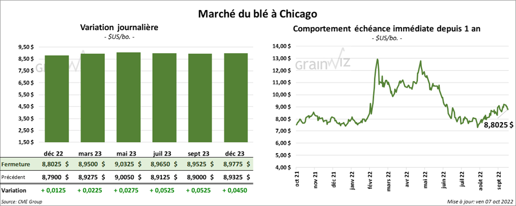 À Chicago, les contrats de blé ont fini la journée en hausse entre 1 ¼ et 2 ¾ cents. À Kansas, ceux de blé dur rouge aux échéances les plus rapprochées ont aussi terminé en progression entre 3 ¾ et 4 ¾ cents. À Minneapolis, les contrats de blé de printemps aux échéances les plus rapprochées ont fermé avec des gains entre 5 ½ et 6 ½ cents.