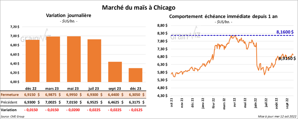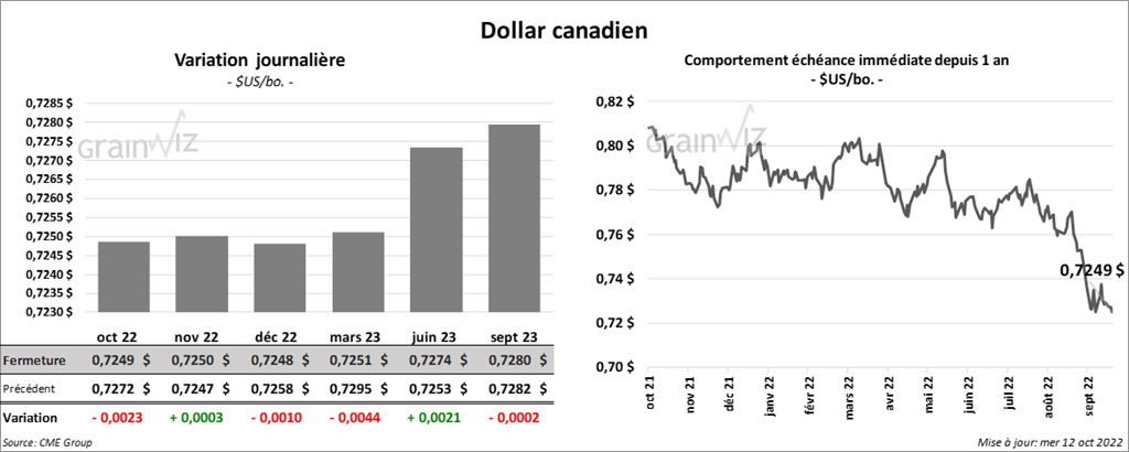 - Le rapport d’offre et de demande d’octobre a été publié ce midi. L’USDA a estimé la production de maïs US 2022/23 à 13,895 milliards de boisseaux, soit à une hausse de 10 millions de boisseaux par rapport aux attentes des analystes et à une baisse de 49 millions de boisseaux comparativement à septembre dernier. Par ailleurs, l’USDA a estimé les stocks de fin d’année de maïs US 2022/23 à 1,172 milliard de boisseaux, ce qui est plus élevé que les anticipations des analystes établies à 1,124 milliard de boisseaux. Toutefois, les stocks de fin d’année étaient plus élevés au mois de septembre dernier avec 1,219 milliard de boisseaux.