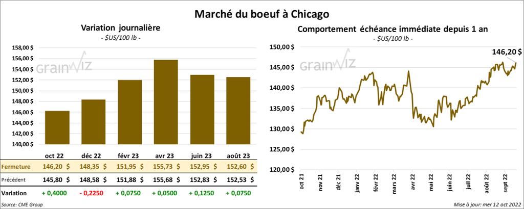 Les contrats de bœuf US aux échéances les plus rapprochées ont fini la séance en hausse entre 7 et 40 cents. Celui décembre 22 a fait exception en terminant en recul de 22 cents. Les contrats de veau US aux échéances les plus rapprochées ont fermé en progression entre 17 et 47 cents.