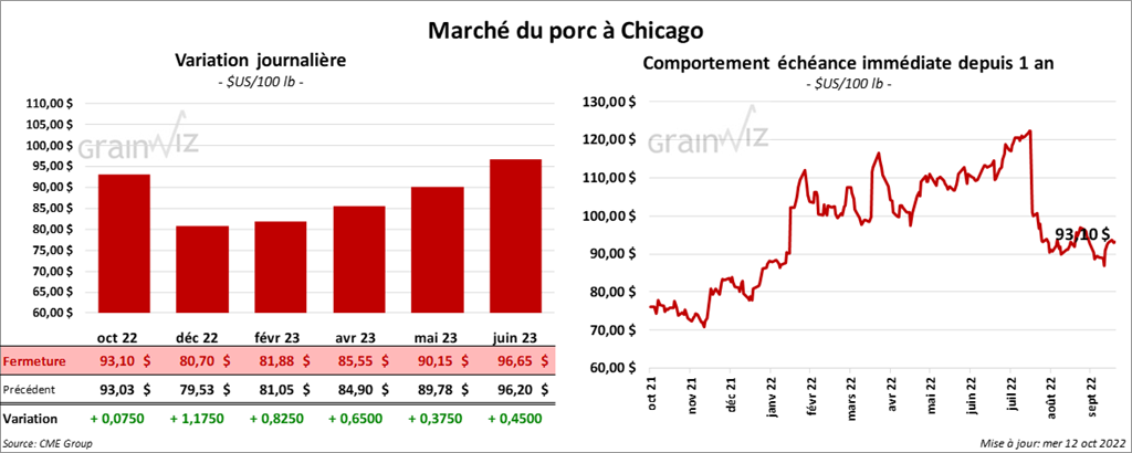 - Le 10 octobre dernier, le CME Lean Hog Index était en baisse de 3 cents à 92,95 $.