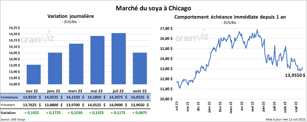 - Concernant le rapport d’offre et de demande, l’USDA estime la production de soya US 2022/23 à 4,313 milliards de boisseaux, ce qui correspond à une baisse de 65 millions de boisseaux par rapport à septembre dernier. Les analystes prévoyaient une production plus élevée à 4,381 milliards de boisseaux. Quant au rendement de soya US 2022/23, l’USDA estime qu’il a reculé de 50,5 bo./acre en septembre à 49,8 bo./acre ce mois-ci. Les analystes s’attendaient plutôt à 50,6 bo./acre.. Du côté des stocks de fin d’année de soya US 2022/23, ils sont demeurés les mêmes par rapport à septembre dernier à 200 millions de boisseaux. Les analystes s’attendaient à 248 millions de boisseaux.