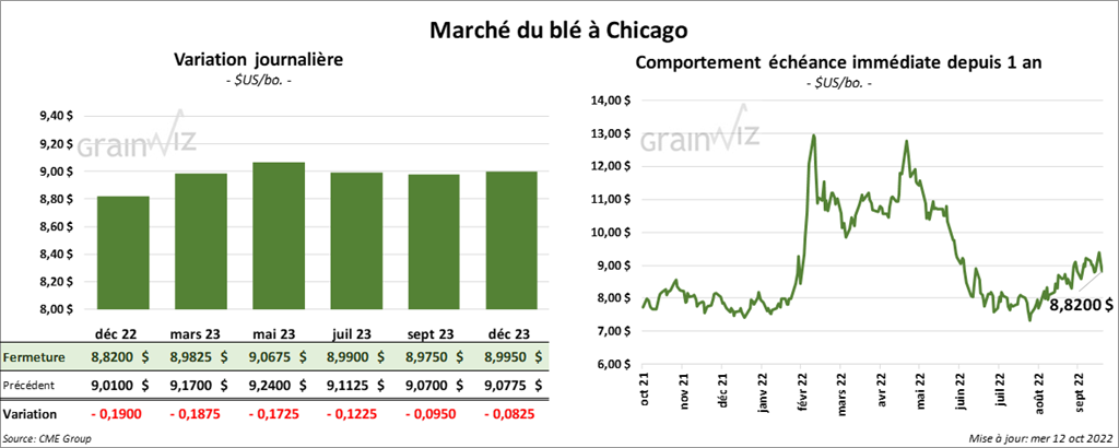 - Pour le rapport d’offre et de demande, l’USDA a estimé les stocks de fin d’année de blé US 2022/23 à 576 millions de boisseaux, soit à une baisse comparativement aux 610 millions de boisseaux de septembre dernier. Les projections des analystes étaient plus basses encore à 554 millions de boisseaux.