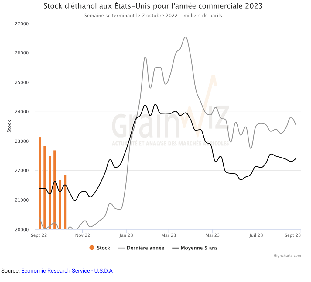 Quant aux inventaires d’éthanol US, ils ont été de 21,863 millions de barils, soit à une hausse de 0,8 % comparativement à la semaine précédente et à une augmentation de 10,2 % par rapport à l’an passé.