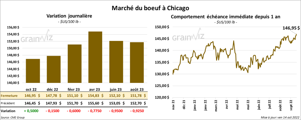 Les contrats de bœuf US aux échéances les plus rapprochées ont fini la journée avec des pertes entre 15 et 60 cents. Celui octobre 22 a fait exception en clôturant en hausse de 50 cents. Les contrats de veau US aux échéances les plus rapprochées ont également terminé en recul entre 95 cents et 1,32 $.